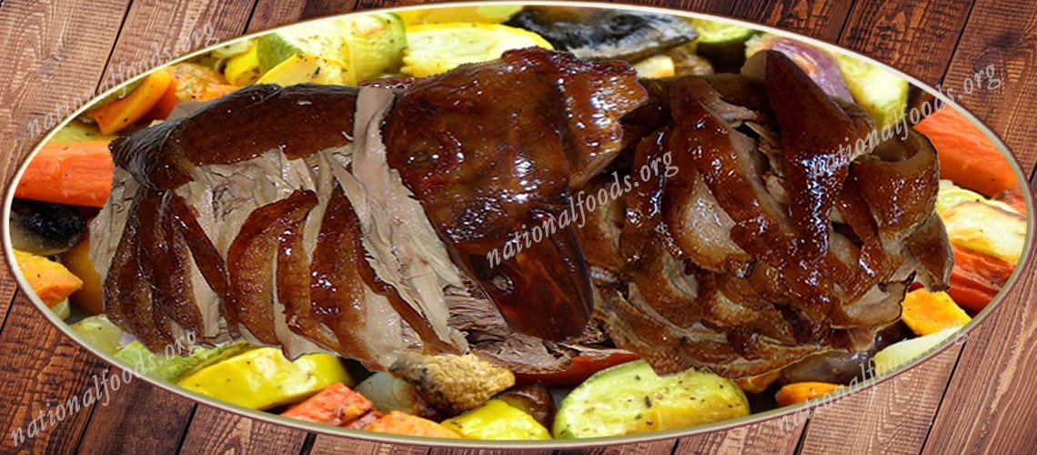 Duck has been roasted in China since the Southern and Northern Dynasties. A deviation of roast duck was arranged for the Emperor of China in the Yuan Dynasty. The dish, originally named “shāo yāzi”, was mentioned in the Complete Recipes for Dishes and Beverages manual in 1330 by Hu Sihui, an inspector of the imperial kitchen.