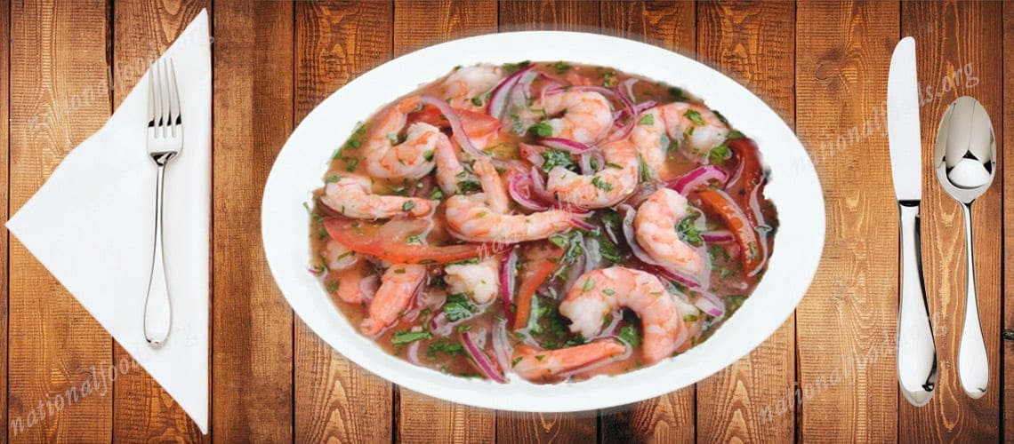 Ceviche is a very popular dish in Ecuador. It is prepared with seafood such as shrimp, lobster, or fish. Red onion, lime, and cilantro are the main flavors in this dish. It is traditionally served cold alongside fried plantain chips, corn nuts, or popcorn.