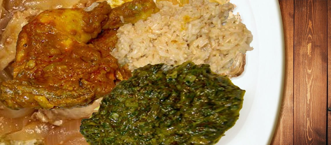 This spicy chicken dish (Poulet Nyembwe) is the national dish of Gabon. The word Nyembwe means palm oil in the Myene language which is spoken in Gabon. Essentially, Poulet Nyembwe is chicken cooked and flavored with palm oil. Smoked chicken is usually used to prepare it. People of Gabon usually serve hot rice, plantain, or mashed yams with this dish.